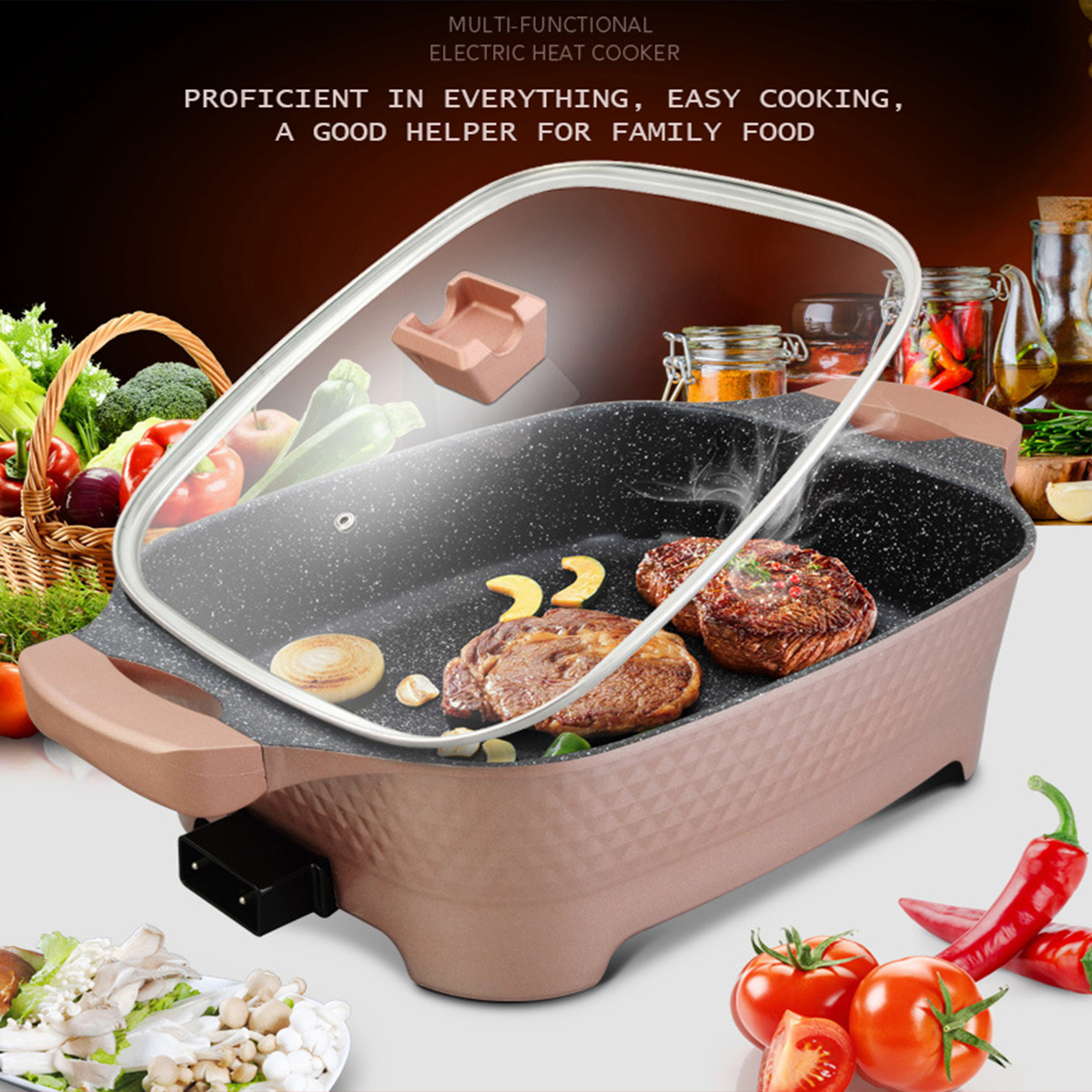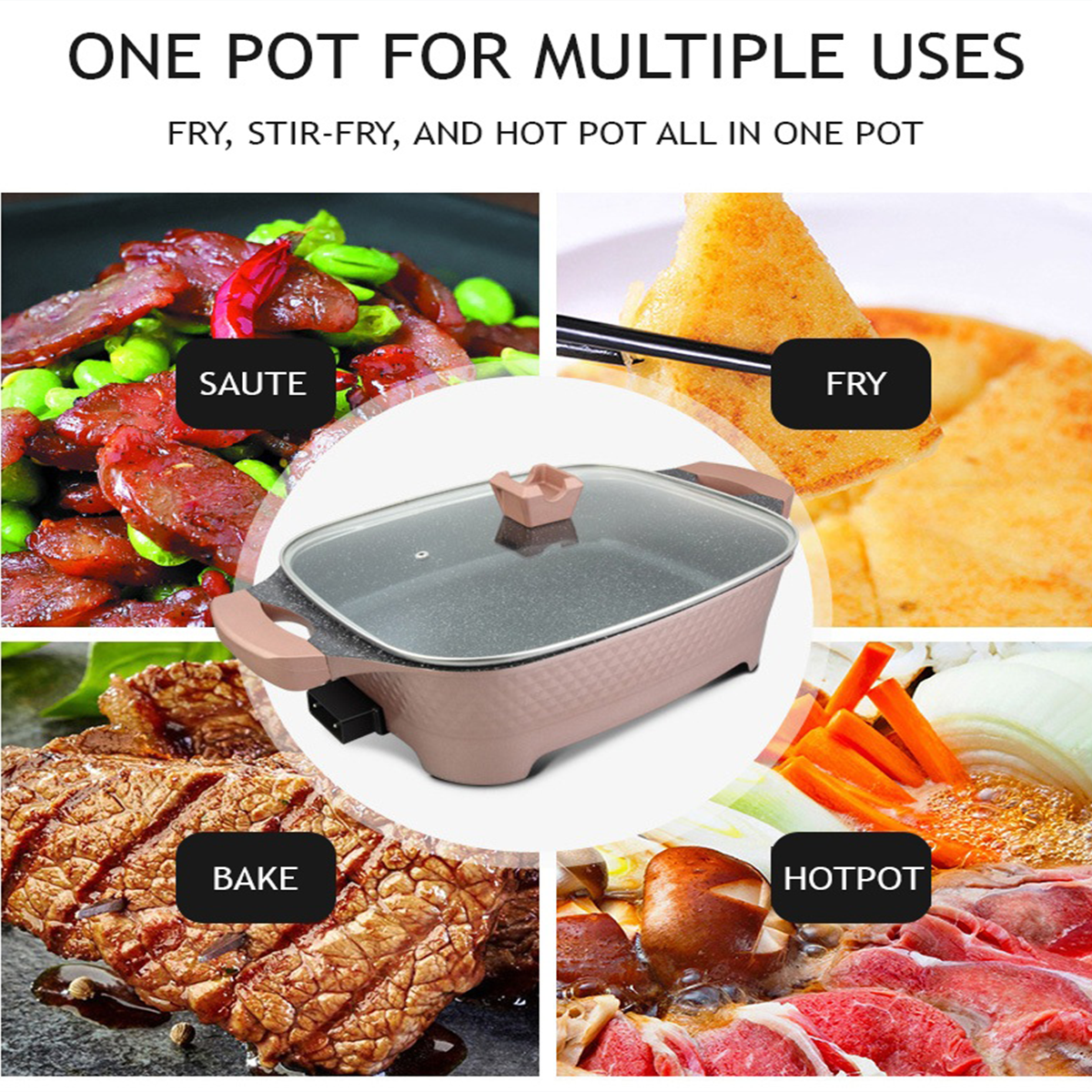 - Elevate your culinary game with our Multi-Functional Electric Cooking Pot – a powerhouse for frying, grilling, roasting, and more. Experience convenience and precision in every dish.