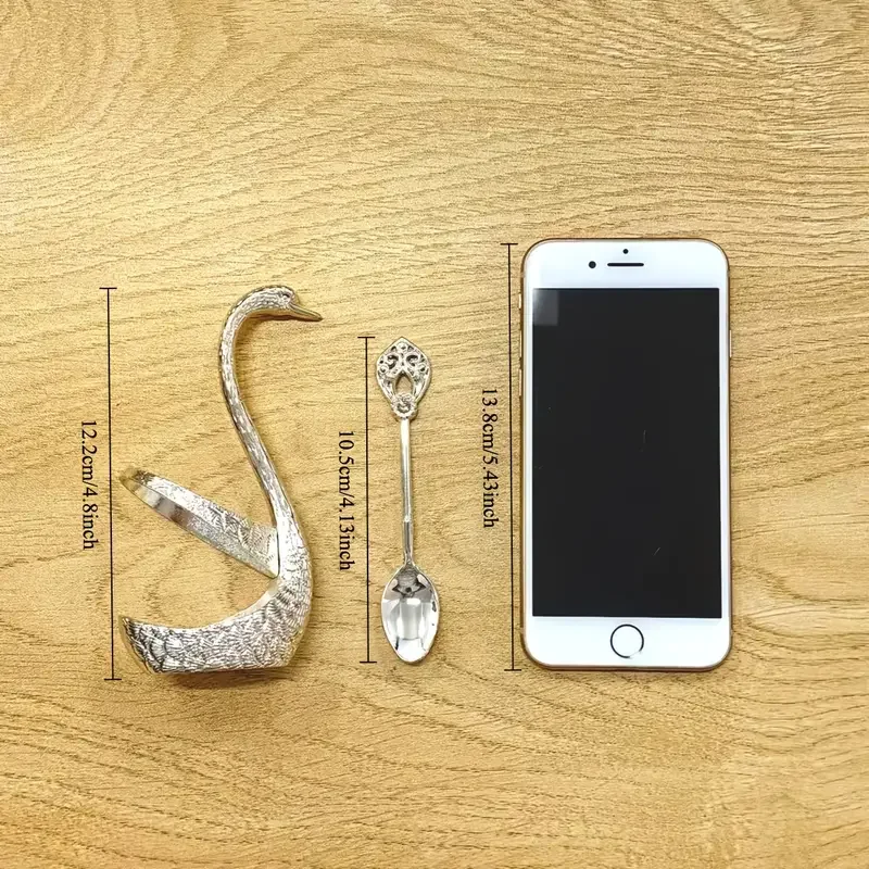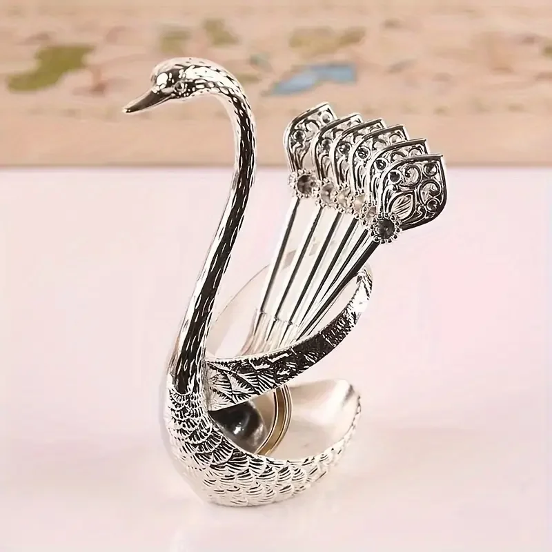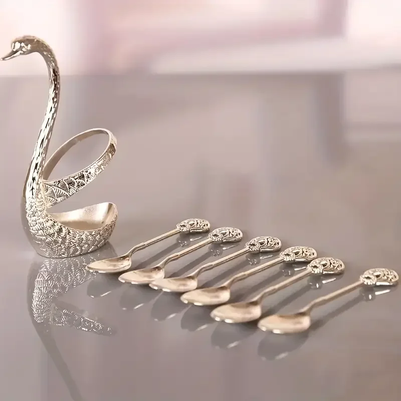 طقم ملاعق قهوة فاخر من 7 قطع بتصميم مستوحى من شكل البجعة، مصنوع من الفولاذ المقاوم للصدأ. مثالي لتقديم القهوة والفواكه والحلويات، بقاعدة مزخرفة تضفي لمسة أنيقة على طاولتك.