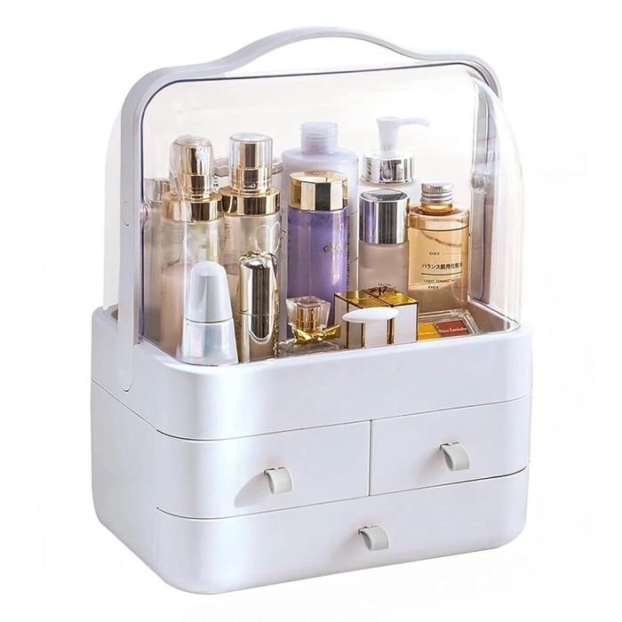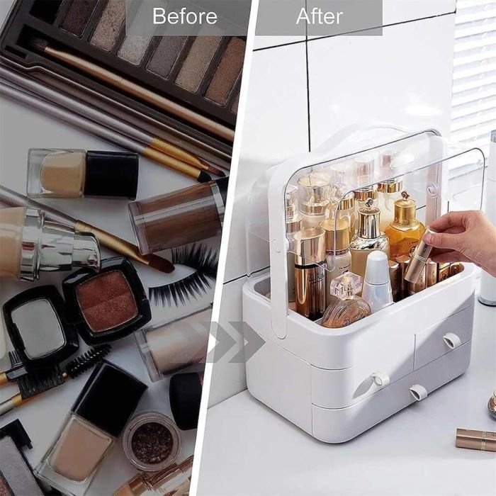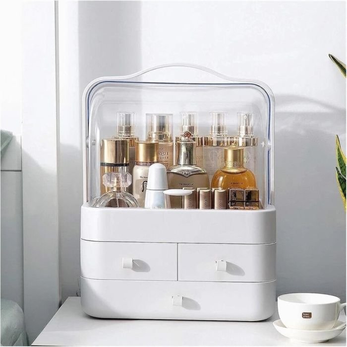 مظهر أنيق – غطاء علوي شفاف مع جسم أبيض ومقابض لطيفة، يتماشى بشكل رائع مع ديكور غرفتك. تعرض مستحضرات التجميل من خلال الغطاء الشفاف. مناسب لمستحضرات التجميل، المجوهرات، الأدوات المكتبية، الهاتف المحمول، بطاقات العمل، وغير ذلك.