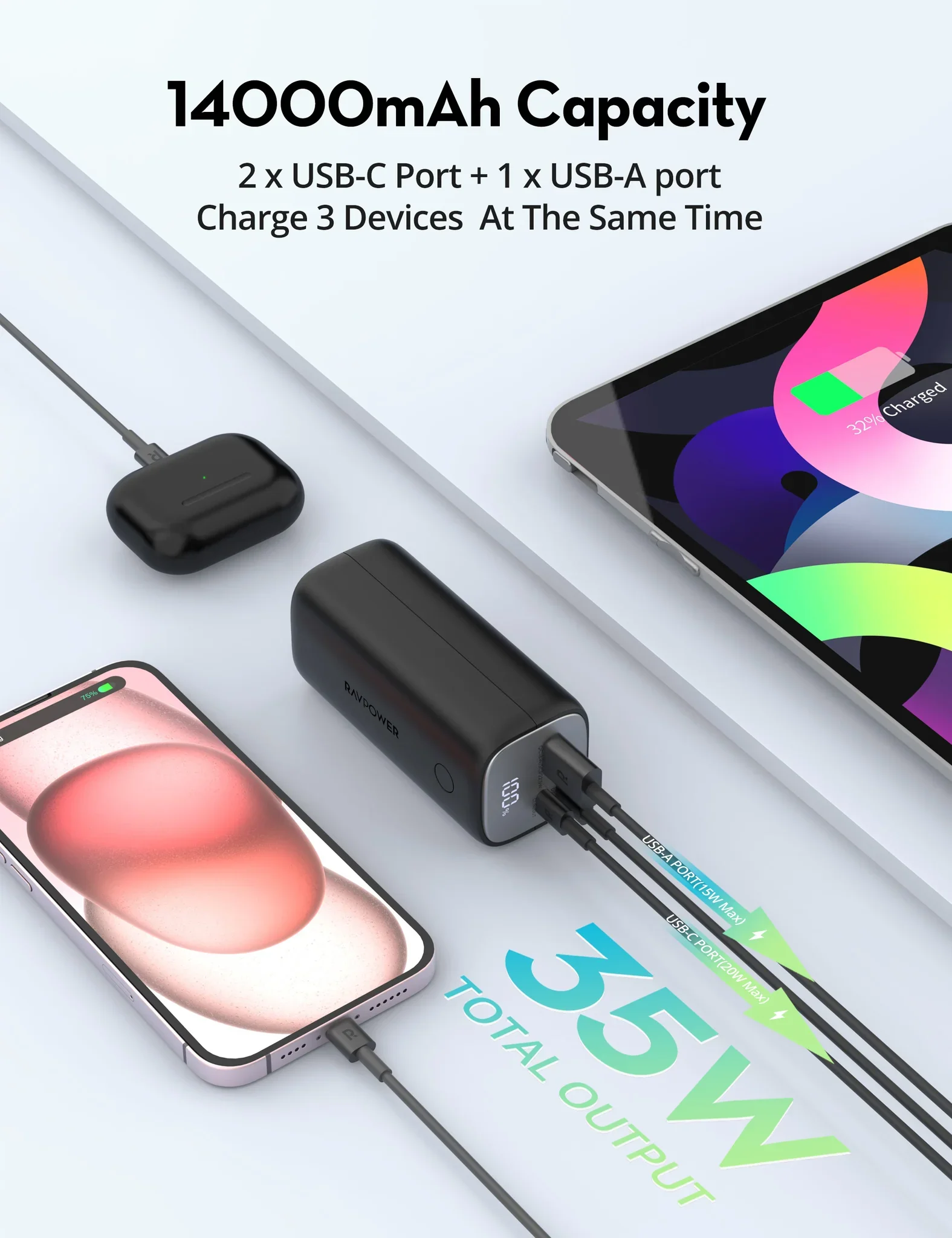 بطارية شحن خارجي محمولة بسعة 14000 مللي أمبير مع 3 منافذ وبقـوة 30 واط - اسود من راف باور