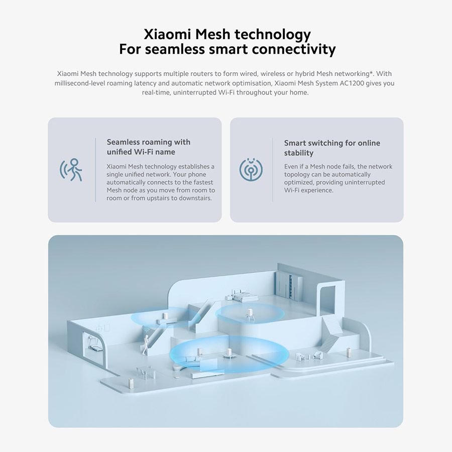 • يعمل نظام Xiaomi Mesh على نطاقي 2.4 جيجاهرتز و5 جيجاهرتز، مما يوفر سرعة مجمعة تصل إلى 1200 ميجابت في الثانية. يوفر نطاق 2.4 جيجاهرتز اتصالاً بسرعة 300 ميجابت في الثانية لمدى أطول، بينما يوفر نطاق 5 جيجاهرتز ما يصل إلى 867 ميجابت في الثانية، وهو مثالي للأنشطة عالية السرعة مثل البث والألعاب عبر الإنترنت ومؤتمرات الفيديو.