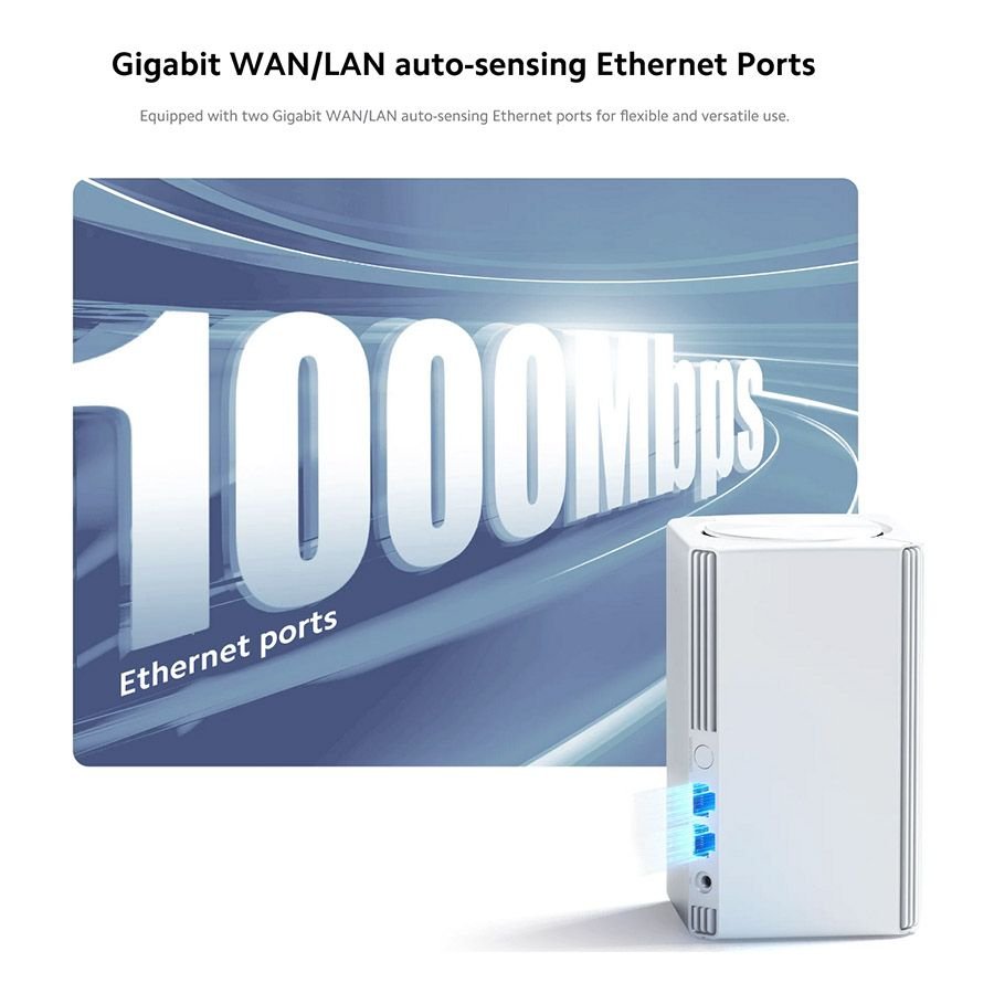 • كل وحدة مجهزة بمنافذ جيجابت إيثرنت (1 WAN و1 LAN)، مما يسمح لك بتوصيل الأجهزة السلكية مثل أجهزة الكمبيوتر المكتبية أو وحدات التحكم في الألعاب أو أجهزة التلفزيون الذكية للحصول على اتصال أكثر استقرارًا وسرعة.