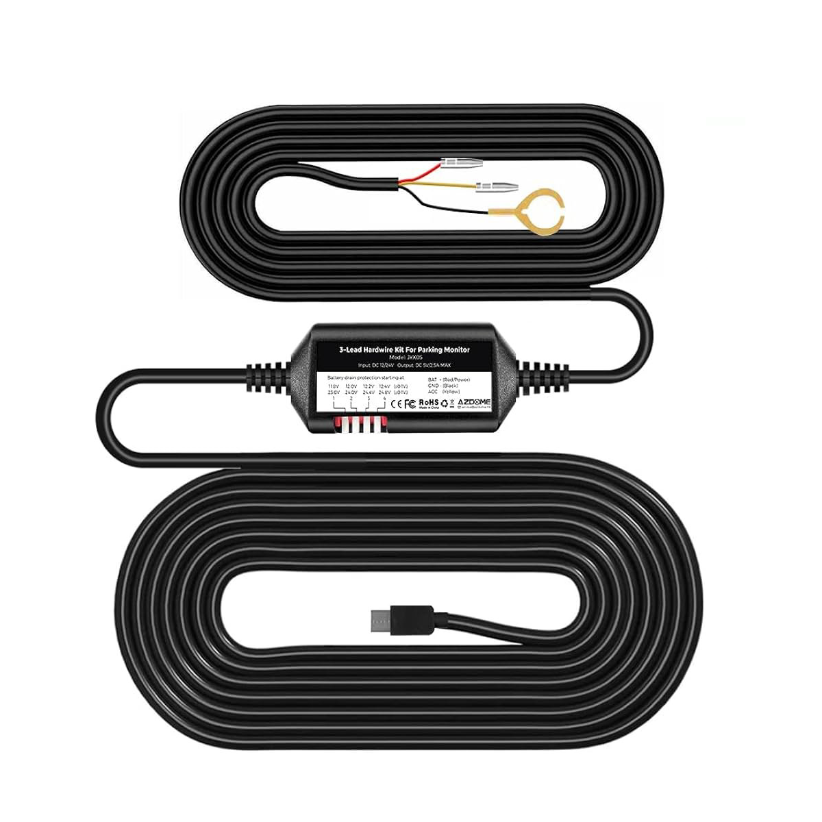 - AZDOME 3-Lead ACC Micro-USB Port Hardwire Kit - This allows the Dash Cam to be installed in your vehicle without the need to use the 12V/24V outlet (car cigarette socket). Converts 12V-24V to Output 5V/2.5A Max.