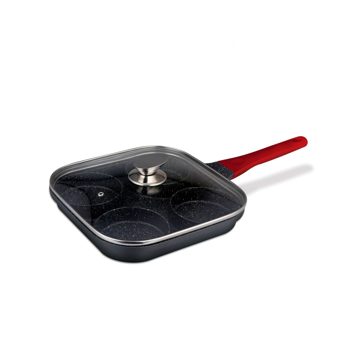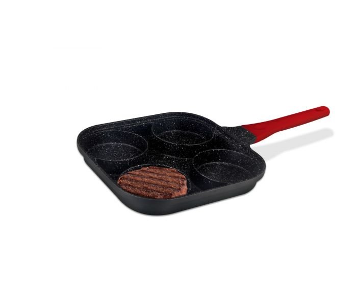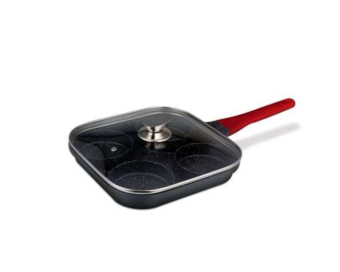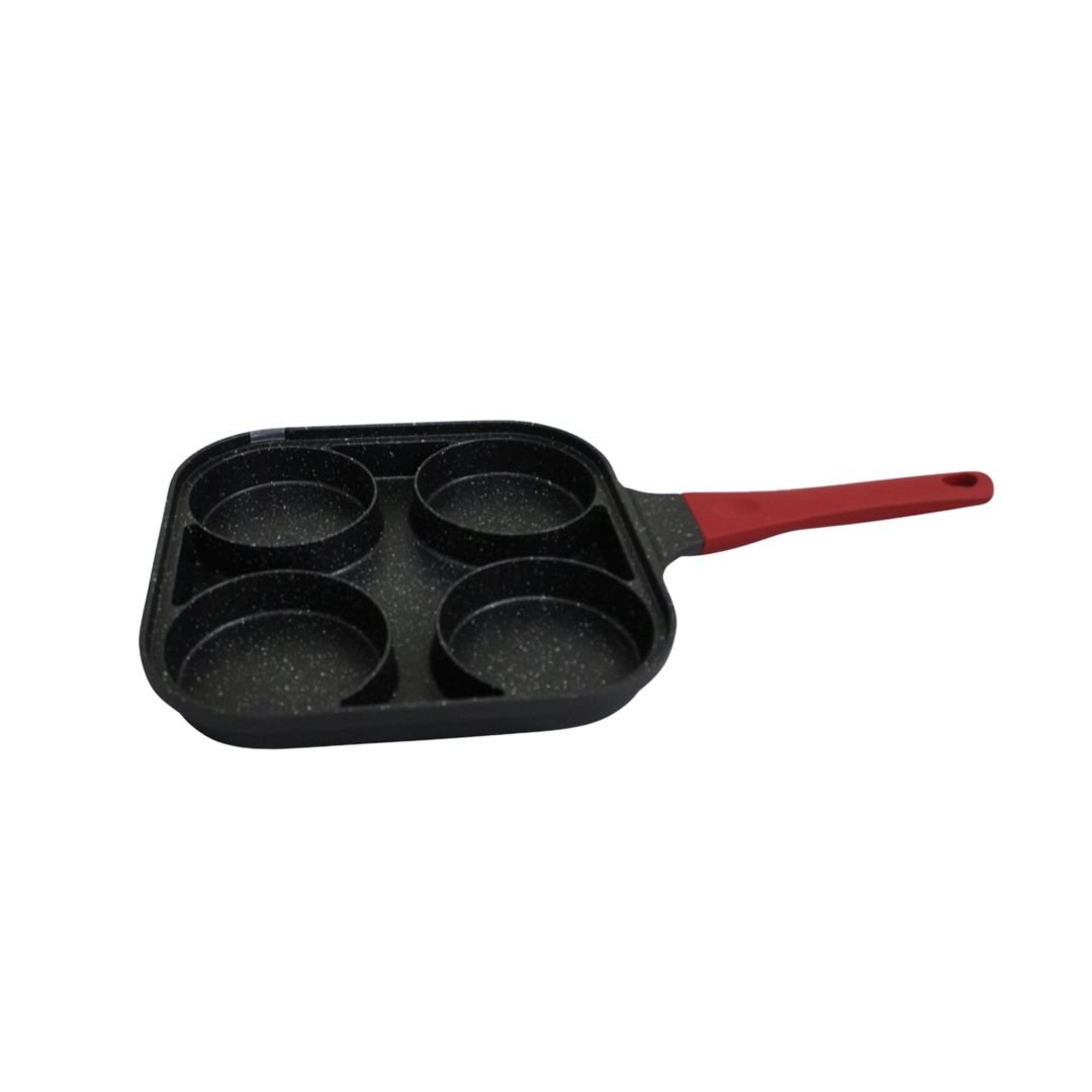 This is a square die-cast aluminum frying pan measuring 26×26×3.5 cm, designed with 4 circular compartments for easy cooking of eggs, pancakes, or small fritters.
