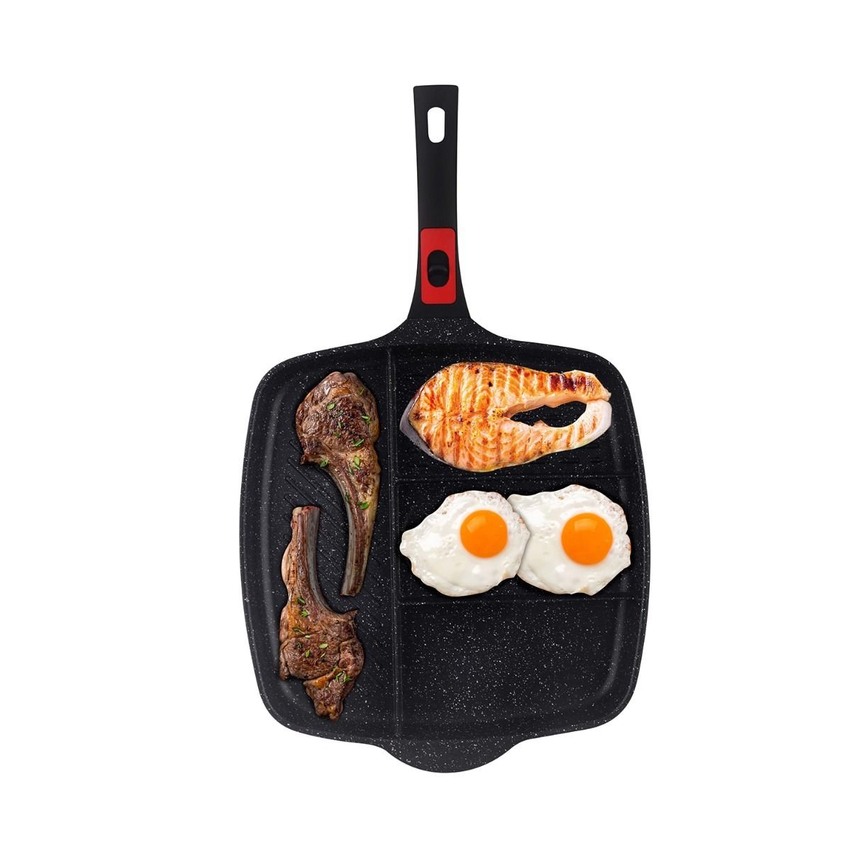 - Flat section – ideal for eggs, pancakes, and vegetables.