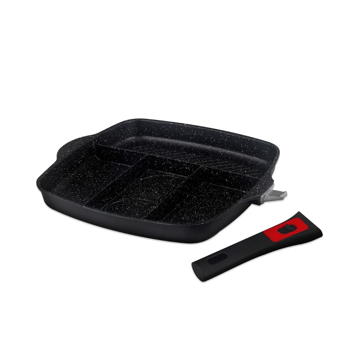 - Detachable handle for space-saving storage and oven use.