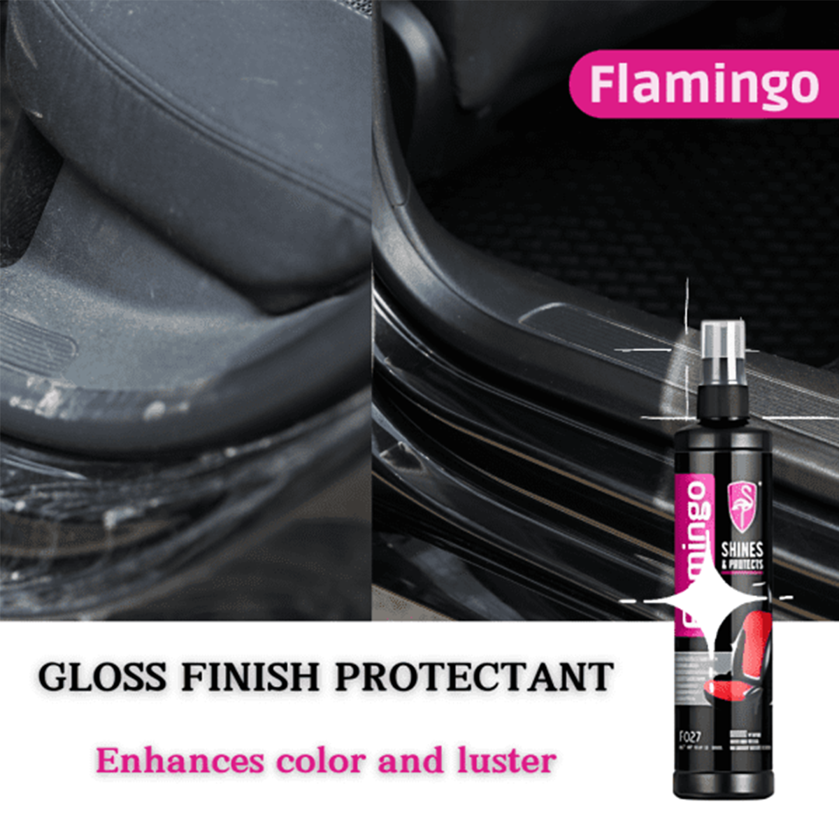 • Flamingo Shines & Protects Protectant's unique polymer silicone formula penetrates surface to shine and protect vinyl, rubber and plastic. Flamingo shines & protects helps protect surfaces from fading and cracking by reducing ultraviolet light, while bringing out color, restoring luster and shine. Protects against abrasion. Reduces static electricity to help reduce dust and dirt attraction! If less shine is desired, lightly buff with damp cloth.