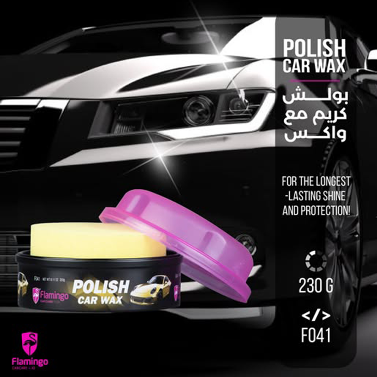 Flamingo Polish Car Wax F041 is a scientifically formulated car wax that provides superior protection and shine to your vehicle. Our expertly crafted formula utilizes 100% real carnauba wax to create a long-lasting barrier against dirt, UV rays, and water spots. Transform your car's appearance with a professional-grade finish.