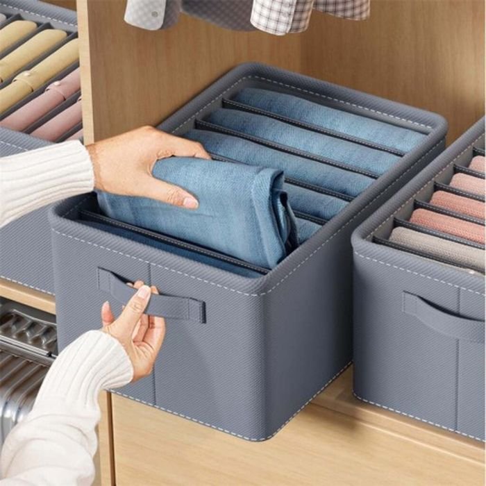 Keep your clothes neatly organized with this versatile drawer organizer, available in two options: 7-grid or 9-grid. Perfect for storing jeans, shirts, sweaters, bras, scarves, and more, each compartment keeps items separated and easy to access. Its foldable design allows for space-saving storage when not in use, while the neutral gray color blends seamlessly with any décor. Made from durable fabric with reinforced edges for long-lasting use—ideal for closets, drawers, wardrobes, and shelves.