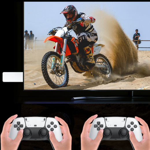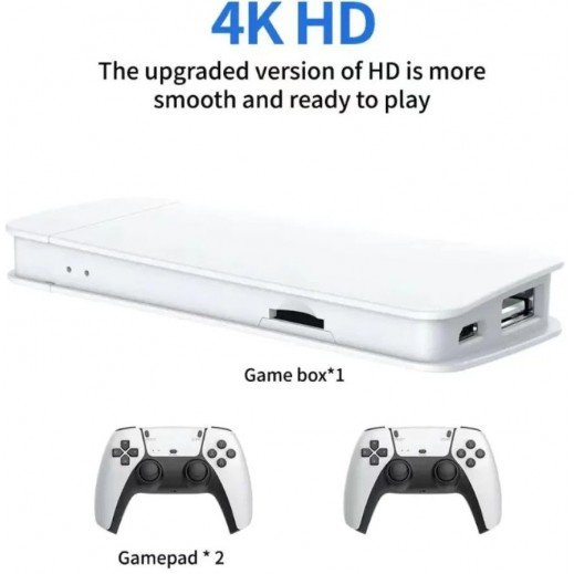 • Plug and play console: no setup required. The steps are as follows: Connect the high-definition output of the TV; Insert the built-in TF game content card; Use the charging adapter to connect the power supply, it will automatically turn on. (2 wireless controllers require 4 AAA batteries, not included)